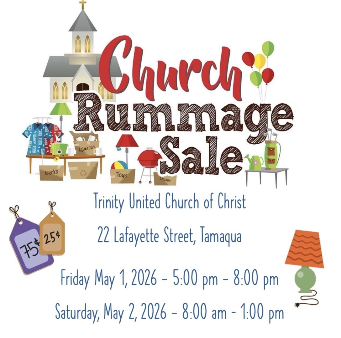 HomeEventsRummage sale Rummage sale Friday, May 01, 2026 5:00 PM - 8:00 PM 5:00 PM - 8:00 PM See all dates and Times Trinity United Church of Christ Parking Deals Get a Ride LYFT UBER Add to Calendar 05/01/2026 05:00 PM 05/01/2026 08:00 PM America/Anguilla Rummage sale Lots of items for sale, cheap Details & Tickets: https://www.upcomingevents.com/allentown/events/trinity-united-church-of-christ-/rummage-sale-638753?ref=uceaddevent Trinity United Church of Christ , 22 Lafayette Street, Tamaqua, PA, 18252 Set Reminder Categories Fundraising & Charity, Neighborhood Neighborhoods Briar Creek (Berwick)Foundryville (Berwick)Breinigsville (Upper Macungie)East Berwick (Berwick) Lots of items for sale, cheap