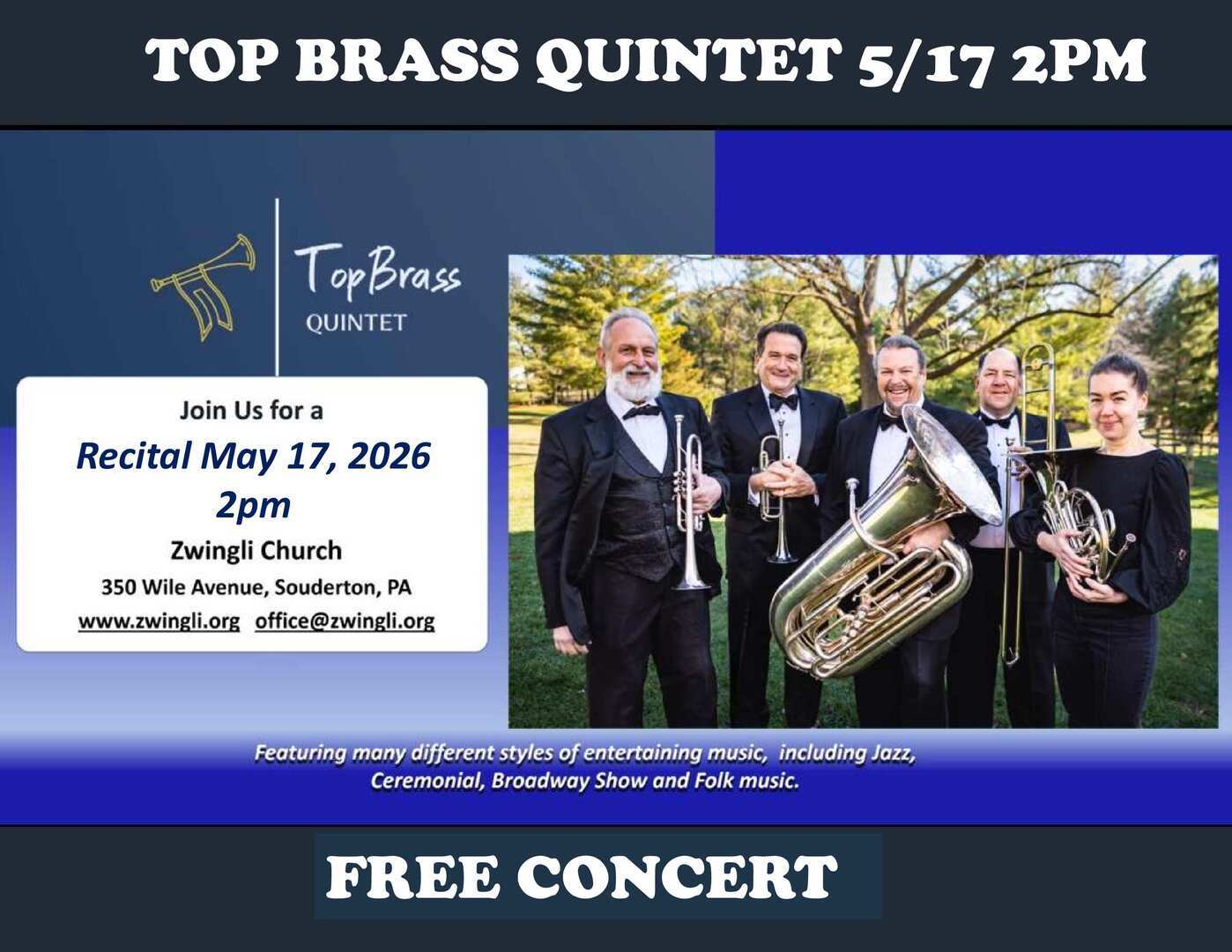 Join us for a free concert by Top Brass Quintet on Sunday, May 17, 2026 @ 2pm. Featuring many different styles of entertaining music, including Jazz, Ceremonial, Broadway Show, and Folk music. Zwingli UCC, 350 Wile Avenue, Souderton, PA. 215-723-1186.