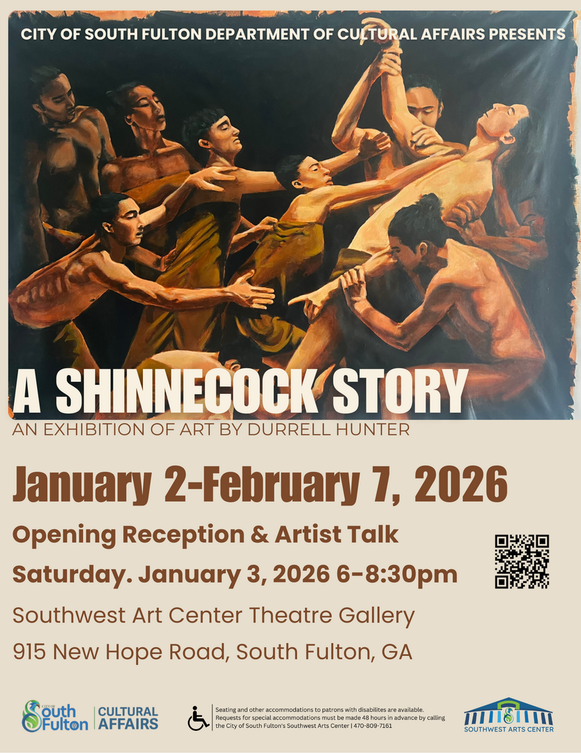 The City of South Fulton Department of Cultural Affairs is proud to present “A Shinnecock Story,” a powerful exhibition by Indigenous artist Durrell Hunter, on view January 3 – February 7, 2026.