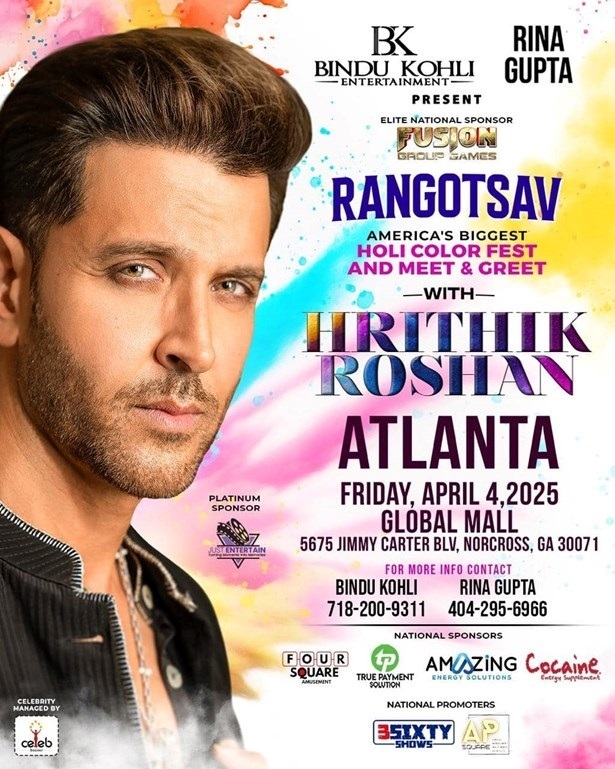 Atlanta, get ready for an unforgettable Holi celebration like never before! For the first time ever, experience an outdoor Holi festival with Bollywood’s ultimate heartthrob – Hrithik Roshan! Celebrate the festival of colors with an explosion of music, dance, vibrant colors, and electrifying energy! This is your chance to enjoy Holi in true Bollywood style with none other than the Greek God of Bollywood himself!