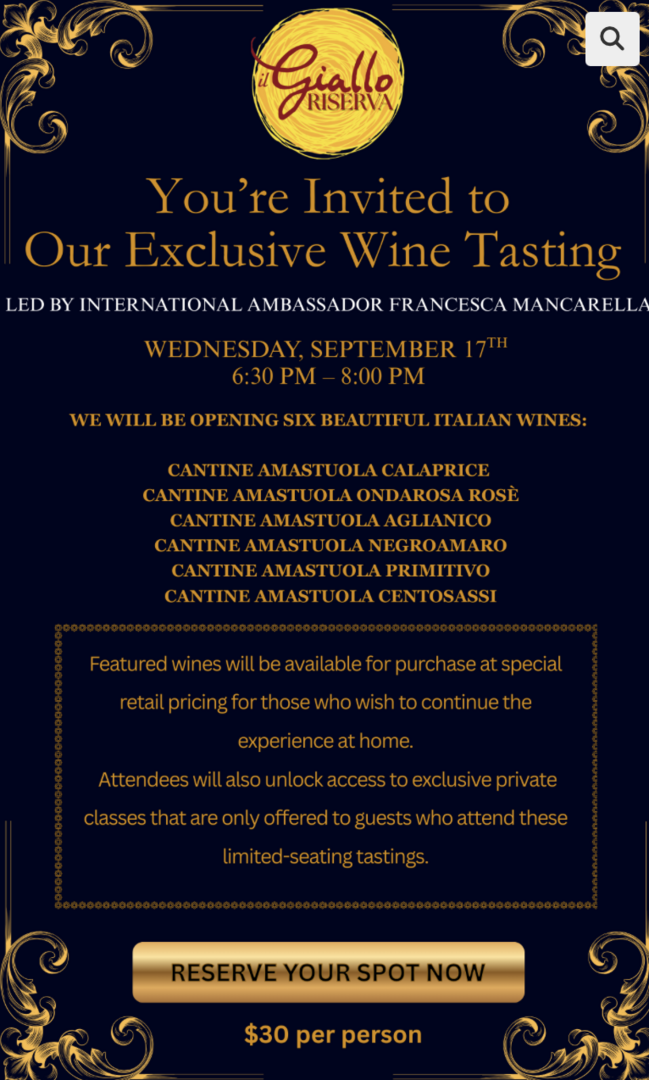 This relaxed, seated wine tasting at il Giallo offers a perfect blend of education, conversation, and discovery. Whether you’re a longtime wine lover or simply curious, you’ll enjoy learning about these certified organic wines from Puglia while tasting them in great company.