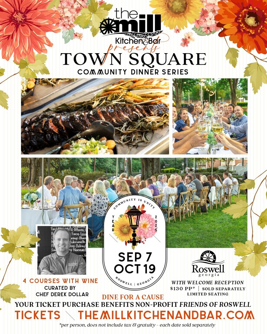 As the premier culinary event in Roswell, The Mill’s Town Square Community Dining Series treats guests to a magical evening dining beneath the twinkling lights of the historic Town Square, surrounded by the warm company of fellow food and wine enthusiasts. The four-course family-style feast is expertly crafted using seasonal, locally sourced ingredients, ensuring a fresh and vibrant culinary journey. The hand-selected wine pairings perfectly complement the flavors of each dish, creating a truly remarkable evening. Seating is limited, ensuring an intimate and refined experience. The evening begins at 6 p.m. with a welcome reception followed by the four-course dinner with wine pairings. Tickets are $130 per person (excluding tax and gratuity). Learn more and purchase tickets online.