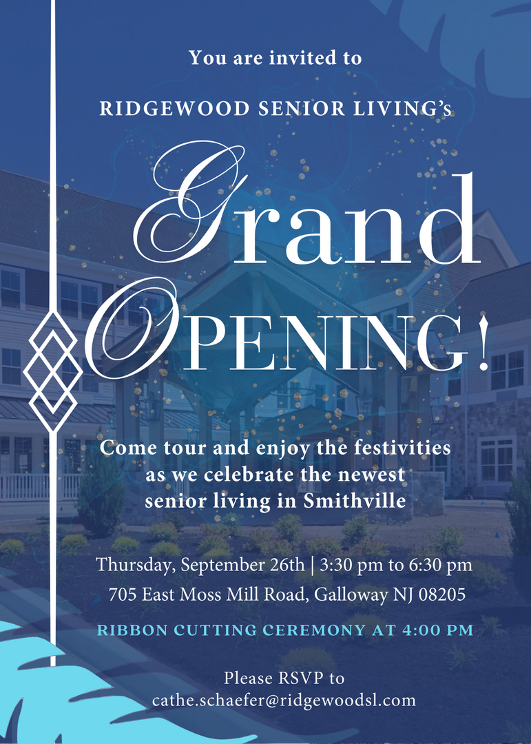 Galloway, NJ – Ridgewood Senior Living is excited to announce the Grand Opening of its new, premier assisted living community on Thursday, September 26, 2024. The event will be held from 3:30 pm to 6:30 pm, with a formal Ribbon Cutting Ceremony at 4:00 pm at the front entrance.