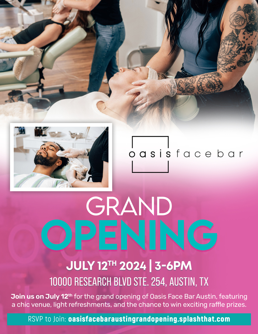 Join us on July 12th for the grand opening of Oasis Face Bar Austin, featuring a chic venue, light refreshments, and the chance to win exciting raffle prizes. Immerse yourself in the glamour and indulge in giveaways, creating unforgettable moments in celebration of beauty and self-care. This event is free and open to the public. Registration is required to attend. Space is limited, sign up today!