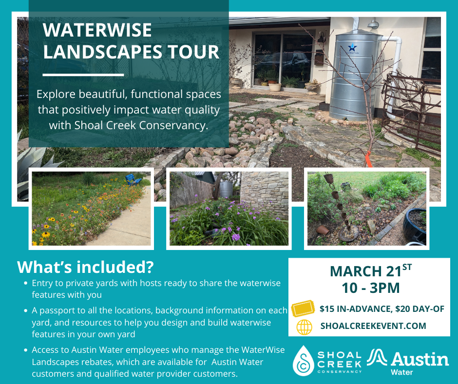 Waterwise Landscapes Tour is an outdoor tour of yards and gardens that capture and filter stormwater to support a healthier Shoal Creek. The tour will feature various forms of landscaping, green stormwater infrastructure, and passive land management to showcase the many ways that homeowners can positively impact water conservation and their nearby waterways. Advanced tickets are $15/person, and day-of tickets are $20/person. Children 12 and under can attend for free. Learn more and purchase tickets today at www.shoalcreekevent.com!