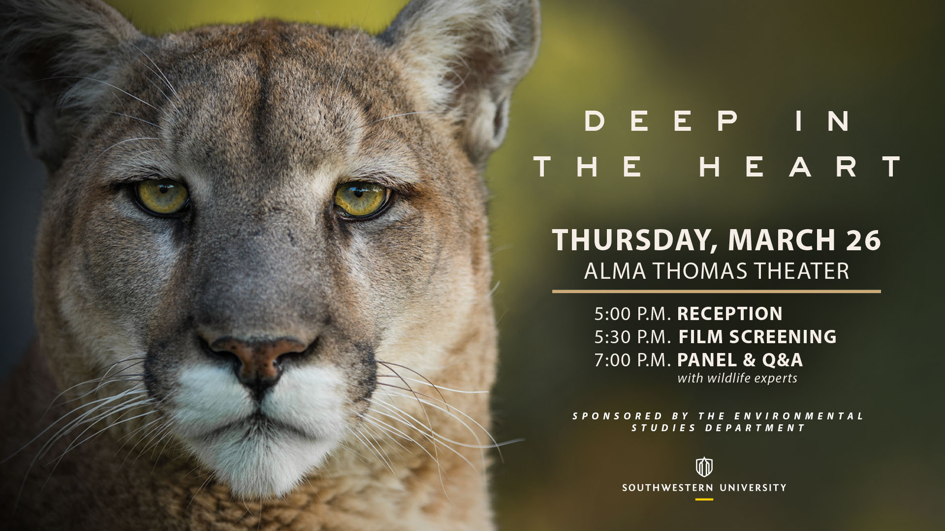 7:00 p.m.: Panel and Q&A session with expert panelists in Texas Wildlife, Urban Ecology, and Documentary Filmmaking