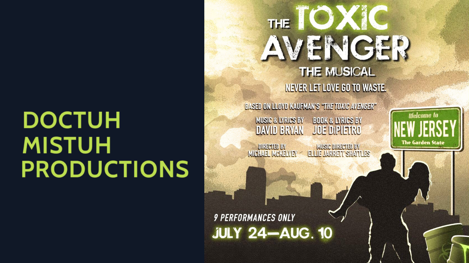 See the off-Broadway hit, The Toxic Avenger, this Summer at Austin Playhouse! The Toxic Avenger is a musical by Joe DiPietro and David Bryan of Bon Jovi and is based on the cult film series of the same title from Troma films. The story follows Melvin Ferb, who two hoodlums throw into a barrel of toxic waste; he emerges badly disfigured but possessing superhero strength.
