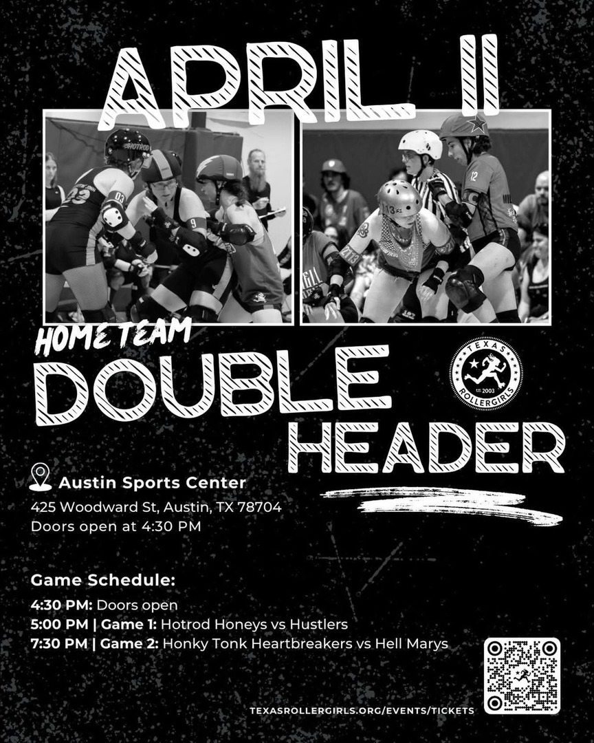 The Texas Rollergirls are back from their exhibition opener to kick off the season with some doubleheader action! Don’t miss the electric Hustlers take on the speedy Hotrod Honeys, followed by the fiery Hell Marys against the two steppin’ Honky Tonk Heartbreakers.