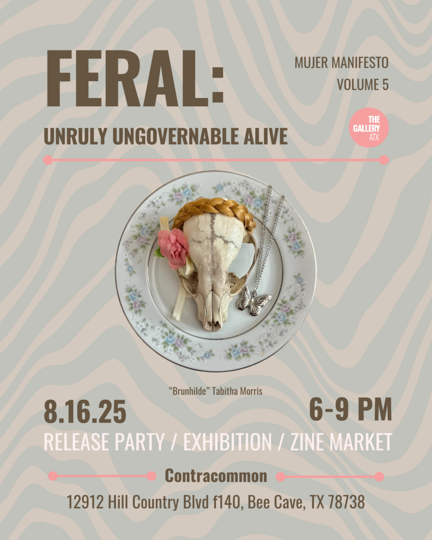 Join The Gallery ATX Saturday, August 16th from 6–9 PM at Contracommon (12912 Hill Country Blvd f140, Bee Cave) for the opening of “Feral”, a group exhibition and zine release of Mujer Manifesto Volume 5.