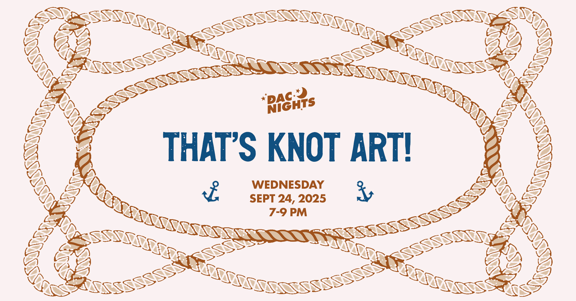 Sail the Seven Seas with DAC Nights this September as we learn to make knot art and listen to rip-roaring sea shanties! Bring your best pirate scowl as DAC staff guide you through a variety of basic and decorative knots. We may not have grog, but you’ll be able to snack on a Davy Jones’ Locker worth of gummy fish and capri sun, just like the ancient pirates did.