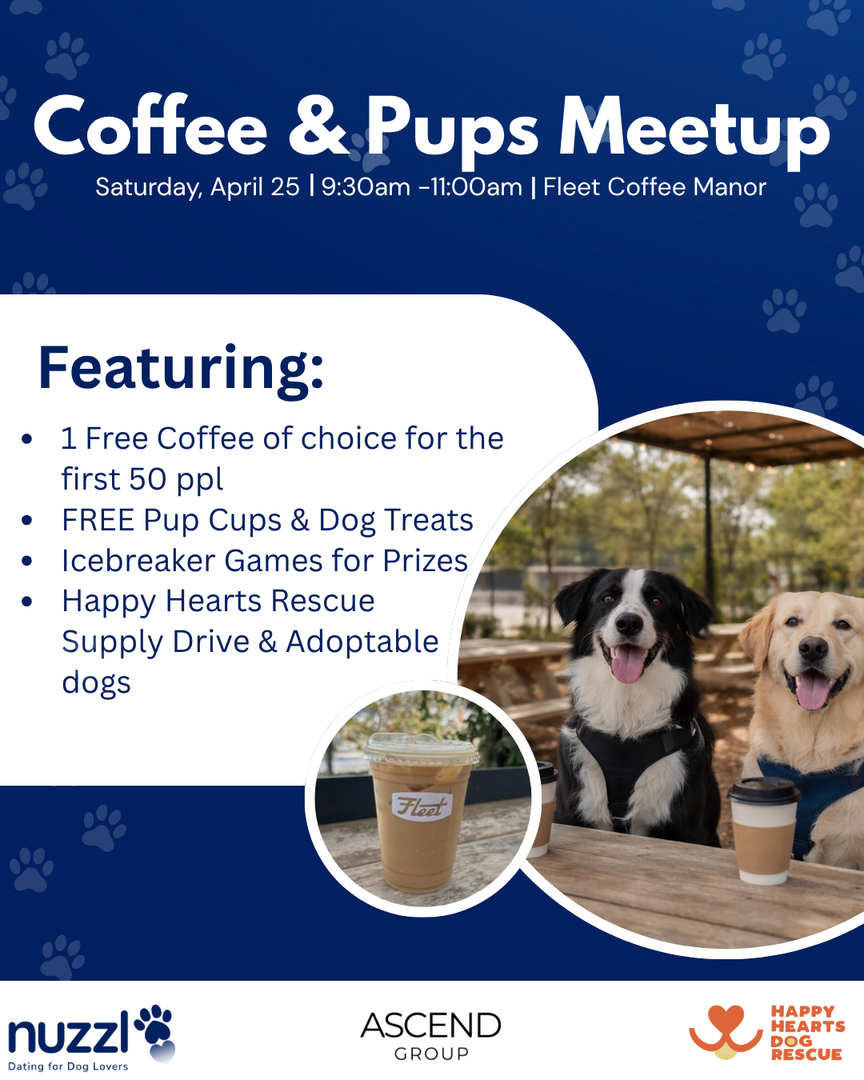 Meet other single dog lovers or make new friends in person at the Nuzzl Coffee & Pups Meetup at Fleet Coffee! Featuring: