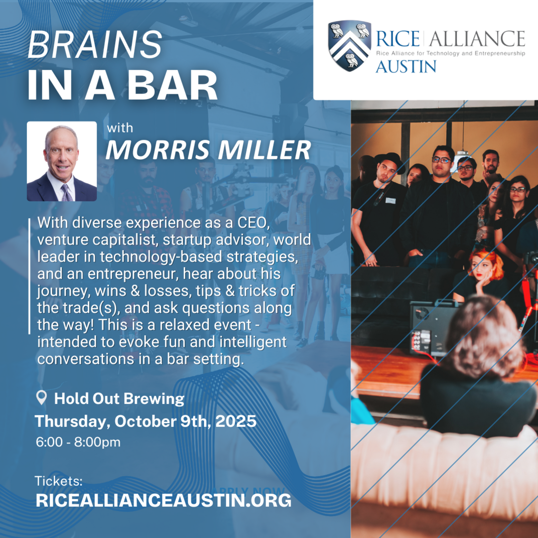 Join Rice Alliance Austin for our next “Brains in a Bar” event with Morris Miller, who has a rich and diverse experience as a CEO, venture capitalist, startup advisor, world leader in technology-based strategies and solutions, entrepreneur, & so much more! Hear about his journey, wins & losses, tips & tricks of the trade(s), and ask questions along the way! This is a relaxed event - intended to evoke fun and intelligent conversations in a bar setting.