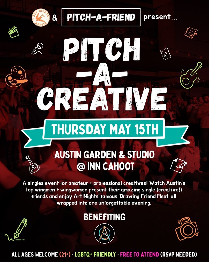 Austin's favorite new singles event is back with a creative twist; the first ever Pitch-A-Creative is set for Thursday, May 15 in partnership with Art Nights ATX over at In Cahoots in their Austin Garden (located at 1221 E 6th St, Austin, TX 78702) starting at 7:00 p.m. This event will feature a similar format to past Pitch-A-Friend events, where Austinites create a two to three-minute presentation about their single friends looking for love, but include a randomized draw your neighbor portion of the evening where creatives meeting for the first time try to capture each other's likeness while sat across a table. The event is free to attend, but it is 21+ and RSVP is required for entry. You can save your spot now by clicking here - https://tinyurl.com/52p52frr.