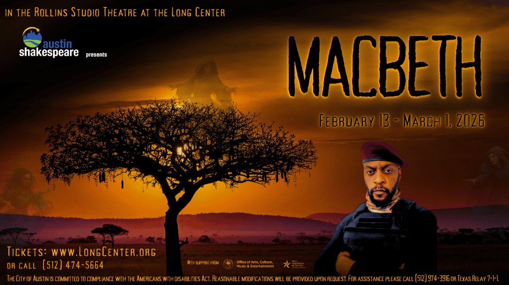Austin Shakespeare will present a bold new production of William Shakespeare’s MACBETH, running February 13 through March 1, 2026, at the Rollins Theater at the Long Center. Set in Africa in the near future, this reimagining brings a fresh cultural lens to Shakespeare’s gripping tragedy of power, ambition and fate.