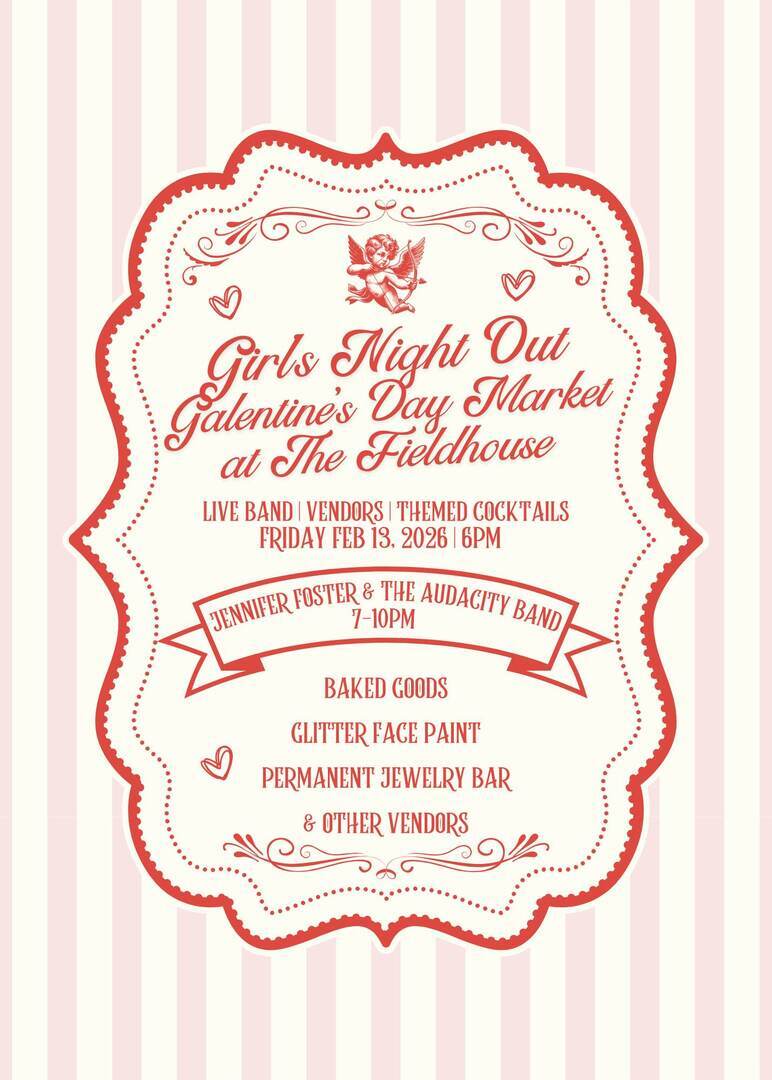 The Fieldhouse is hosting a Girls Night Out Galentine’s Day Market starting at 6pm, complete with local vendors, baked goods, glitter face paint, a permanent jewelry bar, and Jennifer Foster & The Audacity will perform from 7-10 pm.