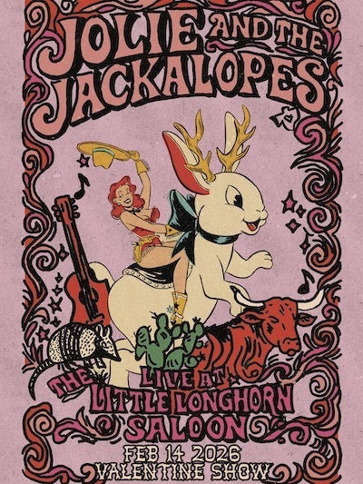 Jolie & The Jackalopes bring their freewheeling, skinny dipping, hot rodding, high rolling “cosmic-billy” sound to The Little Longhorn Saloon on every 2nd Saturday in 2026. Where the hi-tone sound of cosmic country meets the groover’s paradise of the Old Austin Sound, the Jackalopes, led by singer Jolie Goodnight, daughter of legendary producer Joe Gracey and acclaimed singer-songwriter Kimmie Rhodes, carries the torch of Texas’ cosmic cowboy poets while throwing a rock ’n’ roll party you won’t forget.