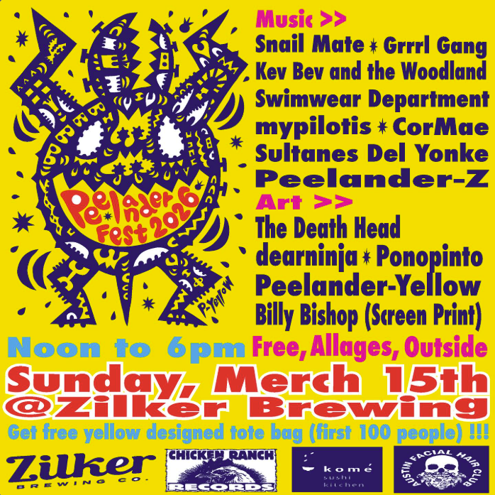 Peelander Fest 2026! Come out and celebrate on Sunday, March 15th. Free, All Ages. Music starts at 12PM and ends with Peelander-Z, as well as live art by many Texas artists. Join us for a great time, bring your smiles!
