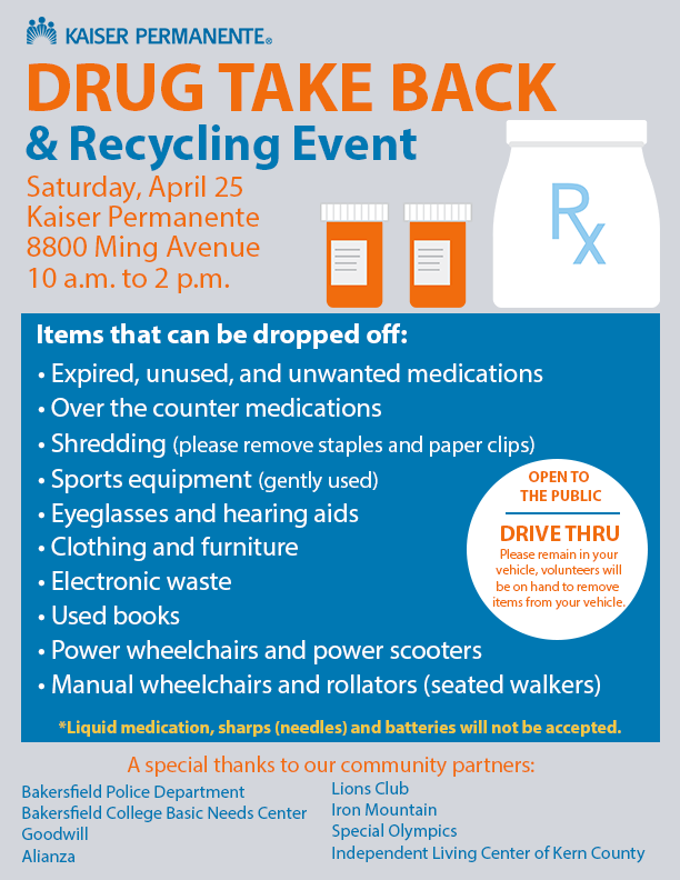 Join us at Kaiser Permanente's Drug Take Back and Recycling Event on Saturday, April 25, 10 am to 2 pm at 8800 Ming Ave. This event is open to the public and is a drive thru - so need to even get out of your vehicle. We will have plenty of volunteers to collect your items. Items that can be dropped off include:
