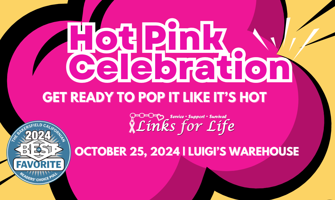 Join Links for Life for a vibrant evening at the Luigi's Warehouse! Put on your BOLDEST shade of pink as we honor breast cancer survivors, support fighters, and raise awareness for breast cancer. Enjoy inspiring stories, exciting entertainment, silent and live auctions, and pink-themed delights. Voted the best in Kern County. Get ready to pop it like it's hot, for the 2024 Hot Pink Celebration!