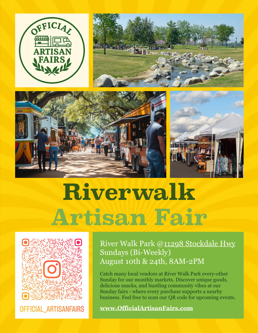 HomeEventsRiverwalk Artisan Fair This Event has Passed Riverwalk Artisan Fair Sunday, August 24, 2025 8:00 AM - 2:00 PM 8:00 AM - 2:00 PM See all dates and Times The Park at River Walk Parking Deals Get a Ride LYFT UBER Add to Calendar 08/24/2025 08:00 AM 08/24/2025 02:00 PM America/Dawson Riverwalk Artisan Fair Feel free to scan our QR code for upcoming events.Event LinksWebsite: https://go.evvnt.com/3174395-0 Details & Tickets: https://www.upcomingevents.com/bakersfield/events/the-park-at-river-walk/riverwalk-artisan-fair-497567?ref=uceaddevent The Park at River Walk, 11298 Stockdale Highway, Bakersfield, CA, 93311 Set Reminder Categories Business & Networking, Business-Related, Craft Beer, Food, Wine, Drink Specials Neighborhoods Brighton (Bakersfield)River Oaks (Bakersfield)Seven Oaks (Bakersfield)Villages of Brimhall - Brimhall Classics (Bakersfield) View Event Website » Feel free to scan our QR code for upcoming events.Event LinksWebsite: https://go.evvnt.com/3174395-0