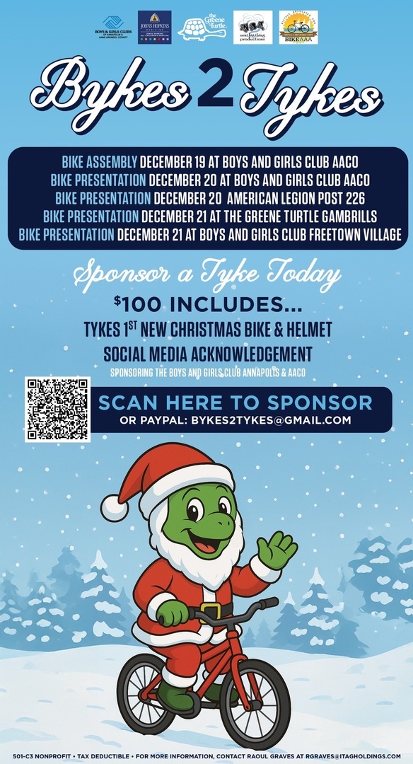 The Greene Turtle is once again proud to support the Bykes 2 Tykes annual fundraiser—helping provide local children with new bikes and helmets this holiday season.