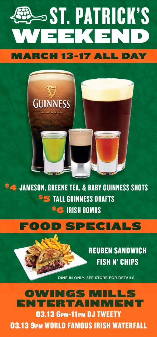 Get ready for one of the most exciting St. Patrick’s seasonal celebrations around! The Greene Turtle in Owing Mills is going all out from March 13–17 with festive food & drink specials and an Irish-inspired menu, paired with festive entertainment including live music and the infamous annual ST Patty’s Irish Waterfall.