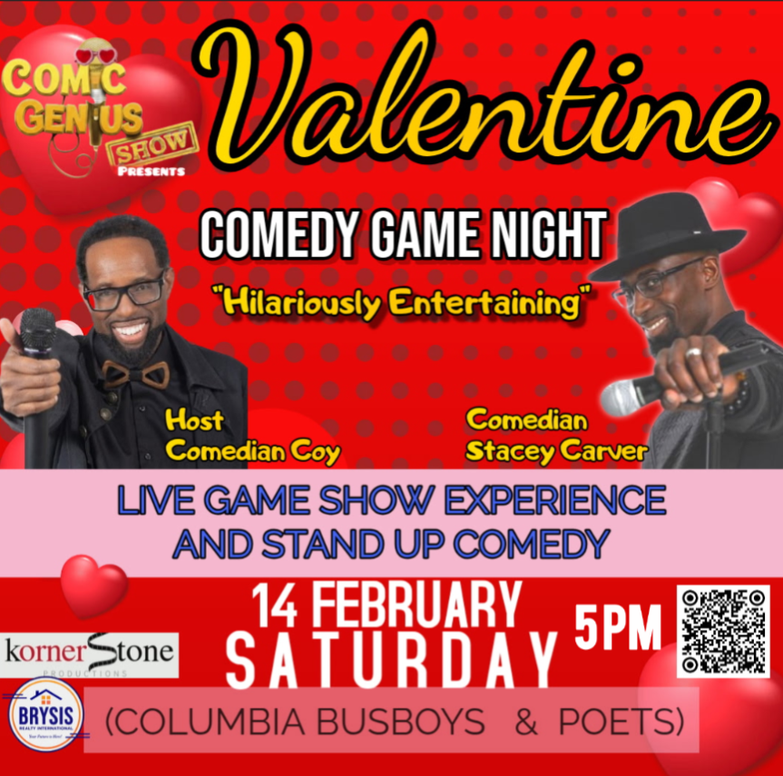 Comic Genius Show presents: Valentine’s Comedy Game Night. A hilariously entertaining interactive comedy Gameshow Experience to play, prizes to win along with some of the funniest clean stand-up comics (seen on TV and streaming platforms)on the planet.