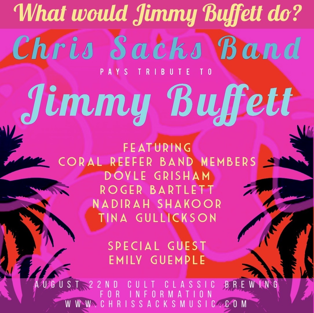 We are proud to present the 3rd annual Chris Sacks Band “What Would Jimmy Buffett Do?” tribute concert on August 22, 2026. The Chris Sacks Band will be performing Jimmy Buffett’s greatest hits, deep tracks and a few originals alongside Coral Reefer Band members Doyle Grisham, Nadirah Shakoor, Roger Bartlett, and Tina Gullickson, with an opening act by Emily Guemple.
