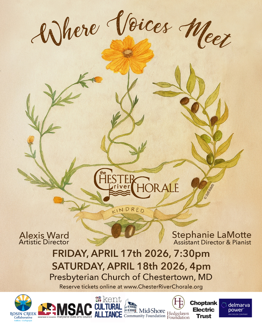 The Chester River Chorale, under the direction of Artistic Director Alexis Ward and Assistant Director Stephanie LaMotte, presents, Where Voices Meet. From Appalachian folk tunes, shape-note hymns, blues, gospel, and spirituals, this program honors the diverse traditions that rise from our shared roots and echo with stories of resilience, hope, and joy.
