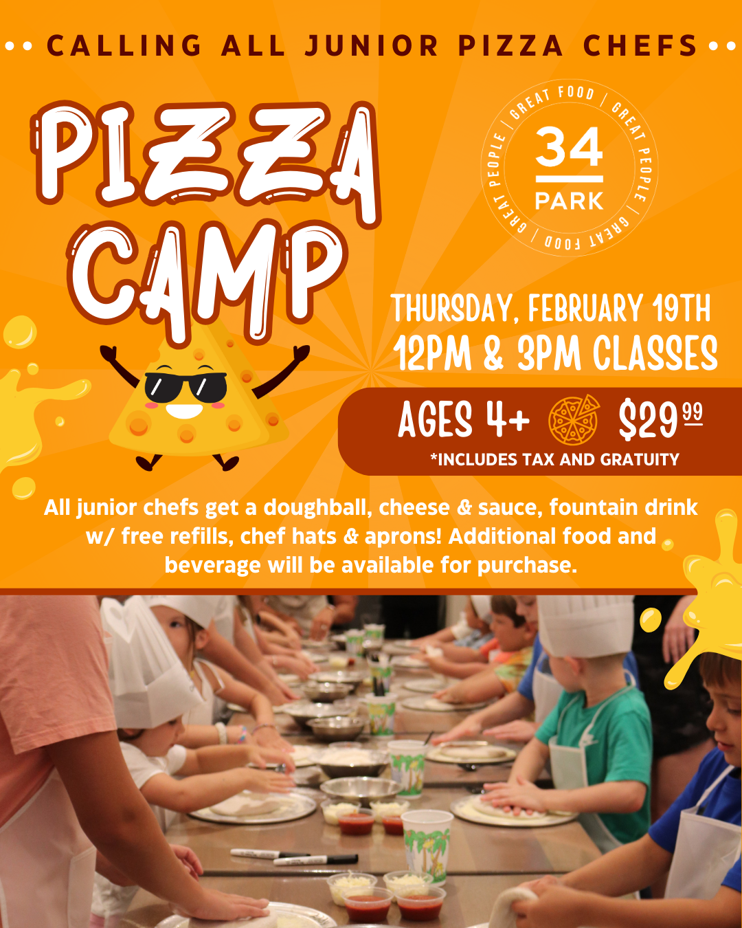 Calling all junior chefs! Kids are invited to roll up their sleeves at 34 Park’s Pizza Camp on Thursday, February 19 during school vacation week. This interactive class lets children create their own personal pizza from scratch while learning the basics of pizza making in a fun, hands-on environment.