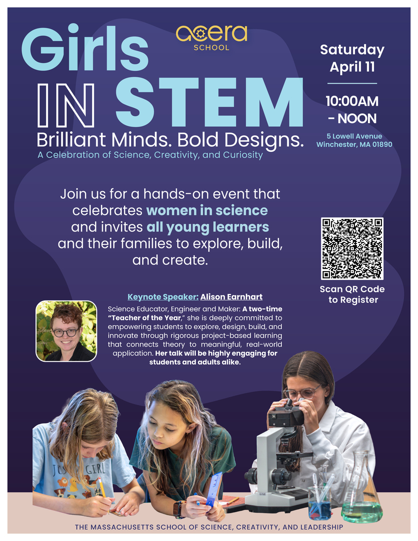 Acera's Annual Girls in STEM event brings together scientists, educators and families to celebrate women in science and invites all young learners to explore, build and create! Keynote Speaker Alison Earnhart, an award-winning Science and Engineering Educator with more than a decade of experience in designing and leading dynamic, hands-on learning environments will be presenting a talk which will be engaging for students and adults alike! Students will also have the opportunity to participate in hands-on stations and engage with others while celebrating all things STEM!