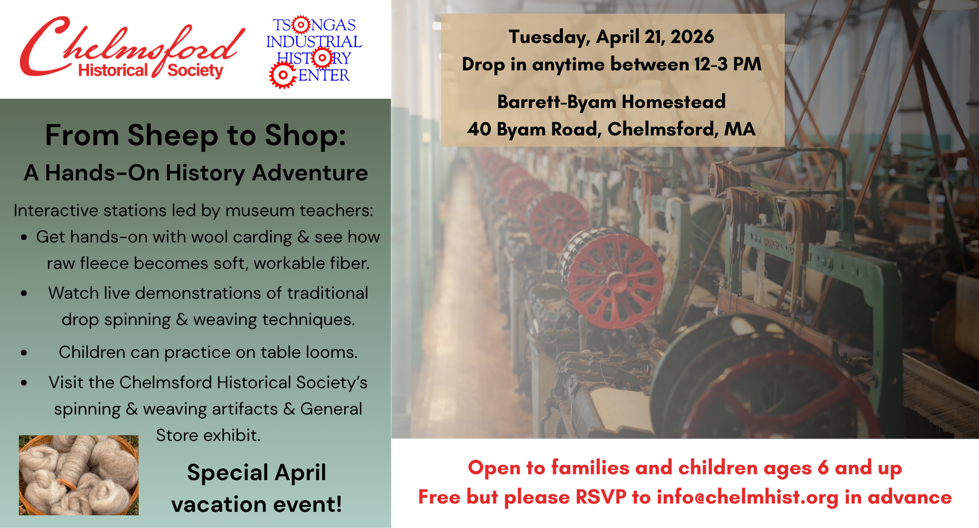 -Shop: Imagine what the past was like as you visit the Chelmsford Historical Society’s spinning and weaving artifacts and General Store exhibit.