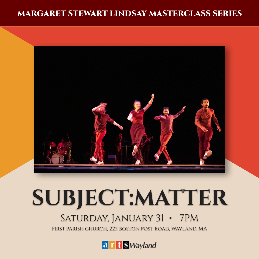Arts Wayland presents an evening of rhythm and sound through live music and tap dance with Subject:Matter, a Boston based tap dance company directed by choreographer Ian Berg. The performance features new music and movement compositions developed during the company’s recent Vermont residency and invites audiences to discover rhythm in unexpected ways.