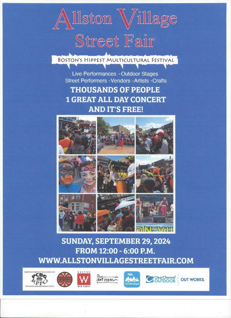 The ADMISSION FREE14th Annual Original September ALLSTON VILLAGE STREET FAIR FESTIVAL (Not A Duplicate Copy) on SUNDAY, SEPTEMBER 29th from 12 - 6p.m. on 6 City Blocks of Harvard Avenue in Allston. Enjoy the multitude of The Brighton Bazaar's curated Arts/Crafts/Vintage Vendors, the AVSF's Stage and Street Performances, the Interactive Public Street Art Mural Area assisted by The Corner Art Room, Zoo New England, Promotional Giveaways, Face Painting, Glitter Tattoos, an International Food Court, the DJ WhySham Dance Party that begins at 5:00p.m., and Much, Much, More!!! 6 City Blocks of FREE All-Ages Interactive Entertainment and FUN! Detailed Event Information and Directions are Posted at: www.allstonvillagestreetfair.com