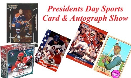 Cardboard Promotions Big Presidents Day Sport Card & Autograph Show, Monday, February 16, 8:30 to 3, Holiday Inn, Dedham. 100 Vendor Tables, Door Prizes, Buy-Sell-Trade Old & New Sports Cards & Memorabilia, 35th annual, $3 admission, under 16 free. Autograph Guests: Hockey Hall of Famer Paul Coffey, current Patriot Jared Wilson, former Patriot Vincent Brown & 1980 Olympic Hockey Gold Medalist Dave Silk. Exit 29A off Rt. 95 to the Holiday Inn