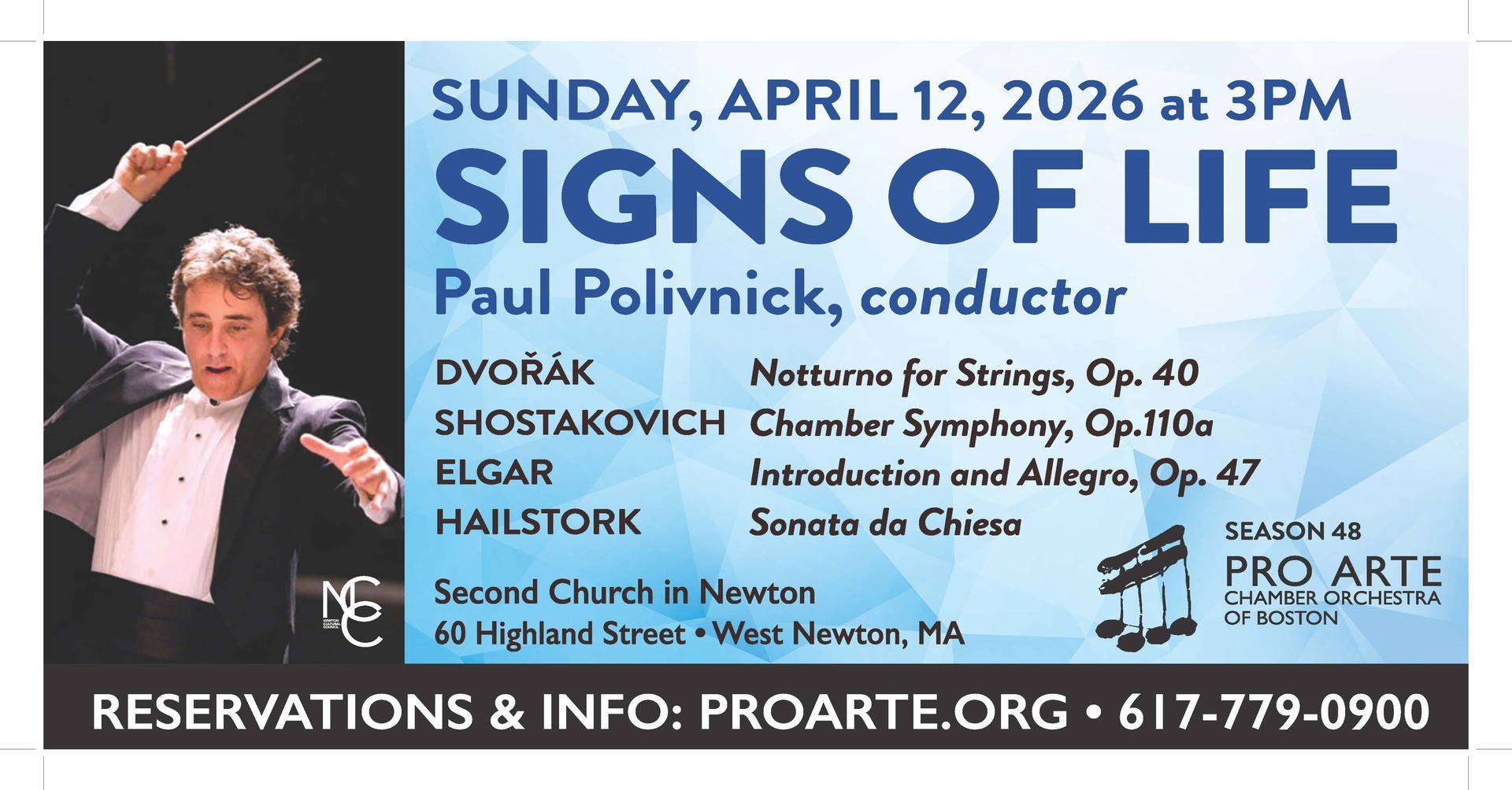 Conductor Paul Polivnick returns to Pro Arte in April for a powerful program of music for string orchestra. Antonín Dvořák transformed an early Andante religioso for string quartet into the luminous Nocturne. Dmitri Shostakovich’s Chamber Symphony was also originally scored for string quartet, but its later orchestration conveys his personal anguish with even greater intensity. Inspired by Latin liturgical texts, Adolphus Hailstork’s Sonata da Chiesa is a contemporary American take on the 17th-century church sonata. Edward Elgar fashioned his rich Introduction and Allegro after another Baroque form, the concerto grosso, which assigns a solo role to a group of players—in this case, a string quartet.