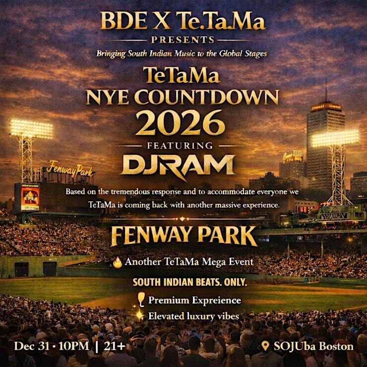 Ring in New Year’s Eve 2025 with NYE with BDE x Te.Ta.Ma — the ultimate South Indian dance party in Boston brought to you by Boston Desi Events. For the first time ever at Fenway, this NYE celebration spotlights a vibrant cultural fusion of Telugu, Tamil, and Malayalam music and dance.
