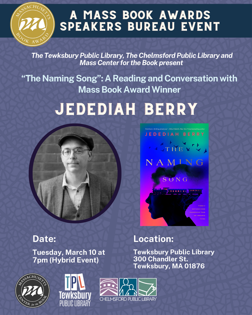Join the Tewksbury Public Library and the Chelmsford Public Library for an evening with Jedediah Berry, author of The Naming Song, winner of the 2025 Massachusetts Book Award in Fiction. Berry will read from his award-winning novel and discuss its imaginative landscape, before opening the floor to an audience Q&A. Attendees may participate either in person or online.