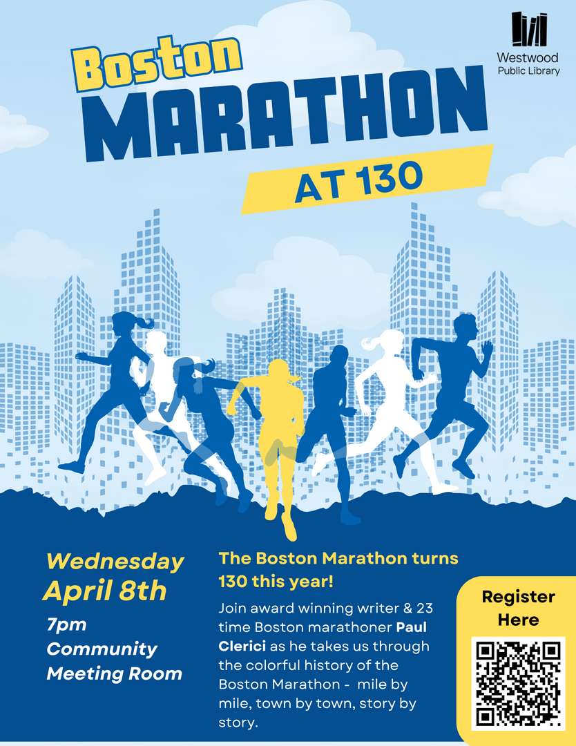At Westwood Public Library on Wed., April 8, 2026 at 7 p.m., join bestselling author Paul Clerici for his new multimedia presentation "Boston Marathon at 130."