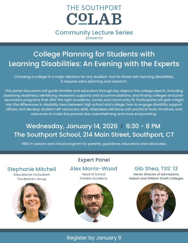 Join us in-person or virtually on Wednesday, 1/14, from 6:30-8 PM for College Planning for Students with Learning Disabilities: An Evening with the Experts.