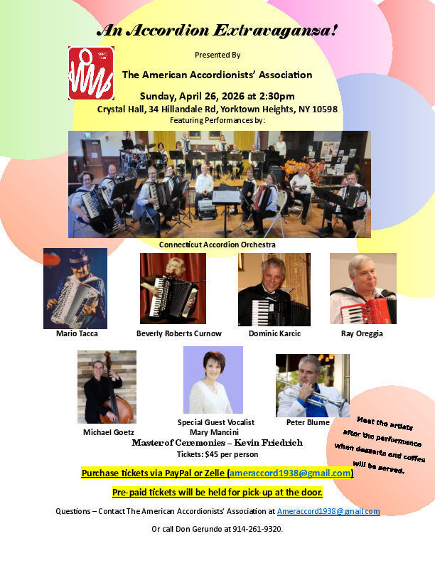 For more information, contact The American Accordionists' Association at [email protected], or call Don Gerundo at 914-261-9320.