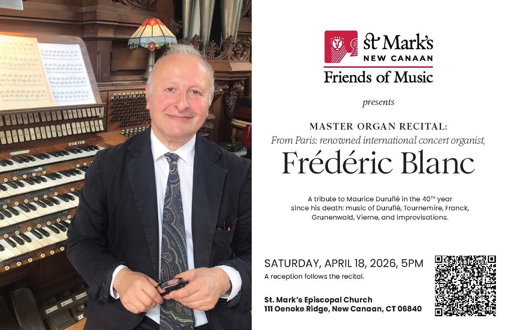 As a tribute to French composer and organist Maurice Duruflé in the 40th year since the death of Duruflé, Monsieur Blanc will present music of Duruflé, as well as other composers of the French school: Tournemire, Franck, Grunenwald, Alain, and Vierne. Monsieur Blanc is highly regarded for his skill in the art of improvisation, with which he will begin and conclude the recital.