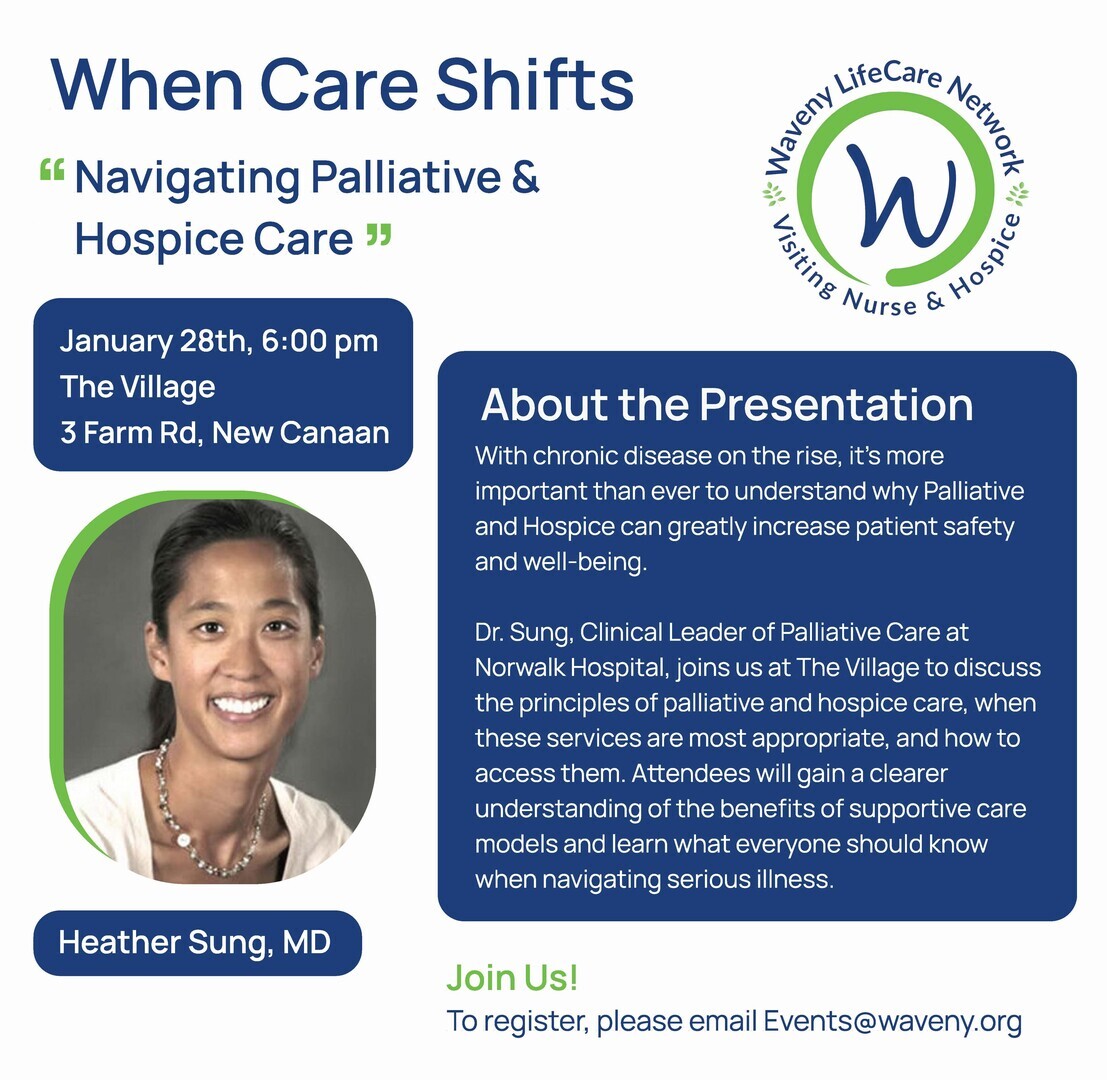 Dr. Sung, Clinical Leader of Palliative Care at Norwalk Hospital, joins us at The Village to discuss the principles of palliative and hospice care, when these services are most appropriate, and how to access them. Attendees will gain a clearer understanding of the benefits of supportive care models and learn what everyone should know when navigating serious illness.