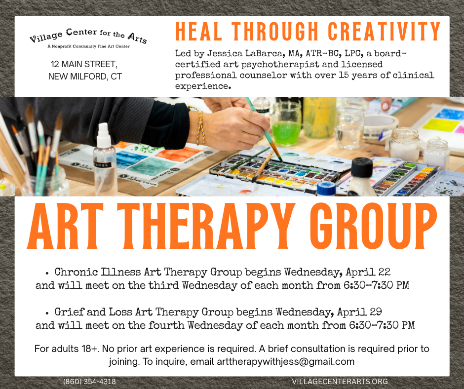 The Village Center for the Arts in New Milford, CT is proud to introduce two new ongoing Art Therapy Group series led by Jessica LaBarca, MA, ATR-BC, LPC, a board-certified art psychotherapist and licensed professional counselor with over 15 years of clinical experience.