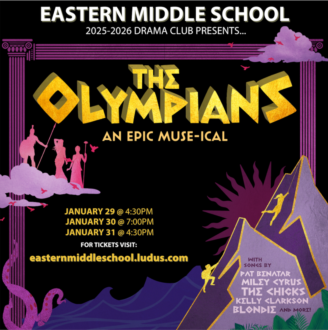 The Eastern Middle School 2025-2026 Drama Club will perform The Olympians in the school’s Lee Book Auditorium on January 29th (at 4:30 pm), 30th (at 7:00 pm), and 31st (at 4:30 pm). Thursday’s tickets are $10, and Friday and Saturday’s tickets are $20. Assigned seat tickets can be purchased online at easternmiddleschool.ludus.com.