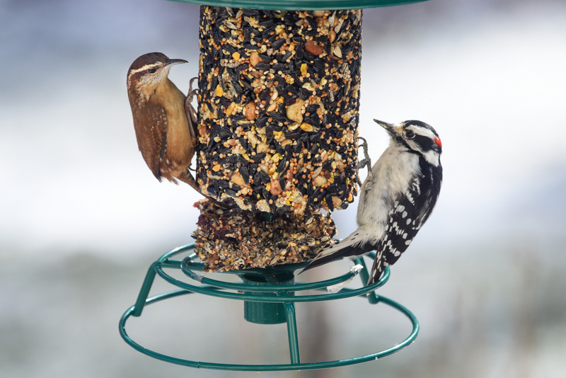 Photo: Carolina Wren + Downy Woodpecker. Deborah Bifulco