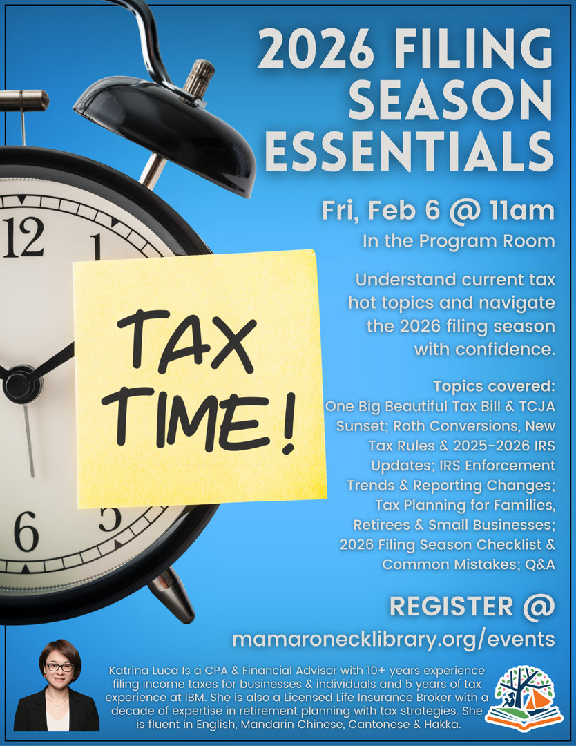 HomeEvents2026 Filing Season Essentials 2026 Filing Season Essentials Friday, February 06, 2026 11:00 AM - 12:00 PM 11:00 AM - 12:00 PM See all dates and Times Mamaroneck Public Library District Parking Deals Get a Ride LYFT UBER Add to Calendar 02/06/2026 11:00 AM 02/06/2026 12:00 PM America/Atikokan 2026 Filing Season Essentials Mamaroneck Public Library mamaronecklibrary.org/events Please see flyer for details.Event LinksInquiries: https://go.evvnt.com/3417482-0 Details & Tickets: https://www.upcomingevents.com/bronx/events/mamaroneck-public-library-district/2026-filing-season-essentials-583810?ref=uceaddevent Mamaroneck Public Library District, 136 Prospect Avenue, Mamaroneck, NY, 10543 Set Reminder Categories Business & Networking, Business-Related Mamaroneck Public Library mamaronecklibrary.org/events Please see flyer for details.Event LinksInquiries: https://go.evvnt.com/3417482-0