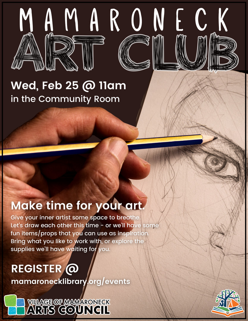 HomeEventsMamaroneck Art Club Mamaroneck Art Club Wednesday, February 25, 2026 11:00 AM - 12:00 PM 11:00 AM - 12:00 PM See all dates and Times Mamaroneck Public Library District Parking Deals Get a Ride LYFT UBER Add to Calendar 02/25/2026 11:00 AM 02/25/2026 12:00 PM America/Atikokan Mamaroneck Art Club Mamaroneck Public Library mamaronecklibrary.org/events Please see flyer for detailsEvent LinksInquiries: https://go.evvnt.com/3463966-0 Details & Tickets: https://www.upcomingevents.com/bronx/events/mamaroneck-public-library-district/mamaroneck-art-club-596622?ref=uceaddevent Mamaroneck Public Library District, 136 Prospect Avenue, Mamaroneck, NY, 10543 Set Reminder Categories Education, Educational, Kids & Family Mamaroneck Public Library mamaronecklibrary.org/events Please see flyer for detailsEvent LinksInquiries: https://go.evvnt.com/3463966-0