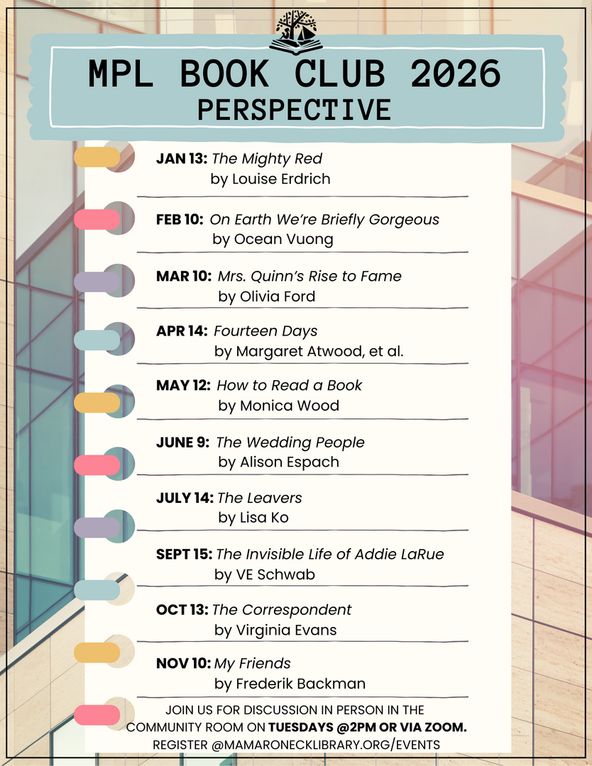 HomeEventsMPL Book Club 2026: Perspective MPL Book Club 2026: Perspective Tuesday, May 12, 2026 2:00 PM - 3:00 PM 2:00 PM - 3:00 PM See all dates and Times Mamaroneck Public Library District Parking Deals Get a Ride LYFT UBER Add to Calendar 05/12/2026 02:00 PM 05/12/2026 03:00 PM America/Atikokan MPL Book Club 2026: Perspective Mamaroneck Public Library mamaronecklibrary.org/events Please see flyer for details.Event LinksInquiries: https://go.evvnt.com/3417311-0 Details & Tickets: https://www.upcomingevents.com/bronx/events/mamaroneck-public-library-district/mpl-book-club-2026-perspective-583733?ref=uceaddevent Mamaroneck Public Library District, 136 Prospect Avenue, Mamaroneck, NY, 10543 Set Reminder Categories Education, Educational, Good For Families Mamaroneck Public Library mamaronecklibrary.org/events Please see flyer for details.Event LinksInquiries: https://go.evvnt.com/3417311-0