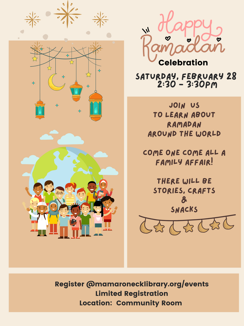HomeEventsRamadan Celebration Ramadan Celebration Saturday, February 28, 2026 2:30 PM - 3:30 PM 2:30 PM - 3:30 PM See all dates and Times Mamaroneck Public Library District Parking Deals Get a Ride LYFT UBER Add to Calendar 02/28/2026 02:30 PM 02/28/2026 03:30 PM America/Atikokan Ramadan Celebration Mamaroneck Public Library mamaronecklibrary.org/events Please see flyer for detailsEvent LinksInquiries: https://go.evvnt.com/3464241-0 Details & Tickets: https://www.upcomingevents.com/bronx/events/mamaroneck-public-library-district/ramadan-celebration-596712?ref=uceaddevent Mamaroneck Public Library District, 136 Prospect Avenue, Mamaroneck, NY, 10543 Set Reminder Categories Good For Families, Kid-Friendly, Kids & Family, Neighborhood Mamaroneck Public Library mamaronecklibrary.org/events Please see flyer for detailsEvent LinksInquiries: https://go.evvnt.com/3464241-0